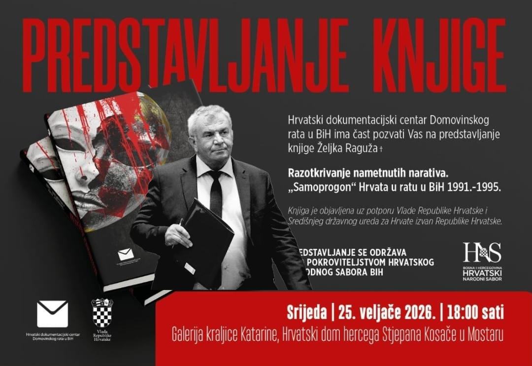 U organizaciji Hrvatskog dokumentacijskog centra Domovinskog rata u BiH, u Mostaru će biti upriličeno predstavljanje knjige pokojnog Željko Raguž pod nazivom „Razotkrivanje nametnutih narativa. ‘Samoprogon’ Hrvata u ratu u BiH 1991.–1995.“. Predstavljanje će se održati u srijedu, 25. veljače 2026. godine u 18:00 sati u Galeriji kraljice Katarine, Hrvatski dom hercega Stjepana Kosače u Mostaru.